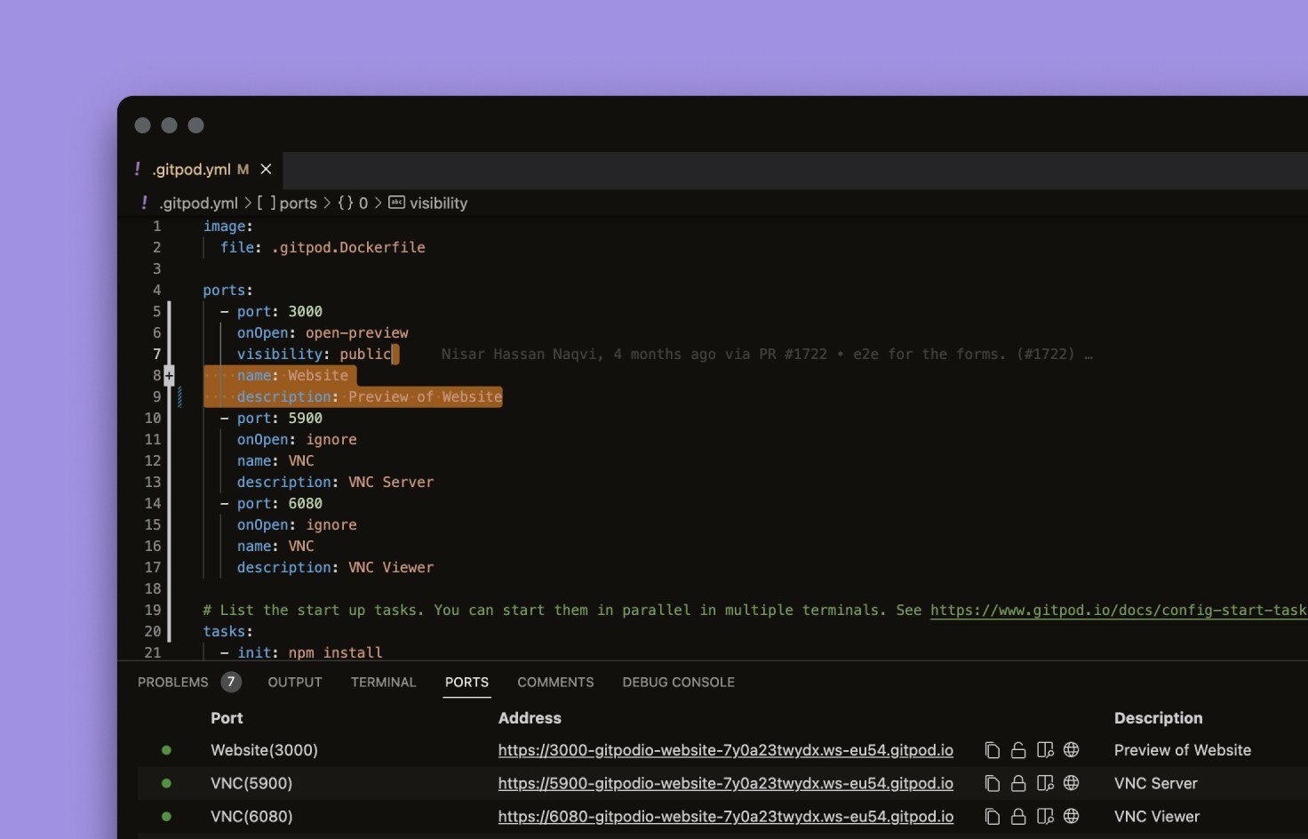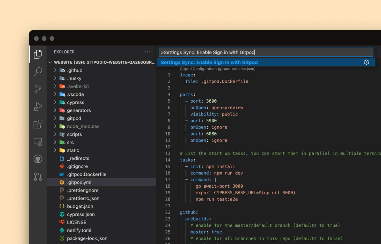 A key part of “Gitpodifying” a project is adding any necessary tasks, such as starting servers or database to your .gitpod.yml. One advantage of declaring these processes in your .gitpod.yml configuration is that your commands are picked up by the IDE or editor and show on workspace start.