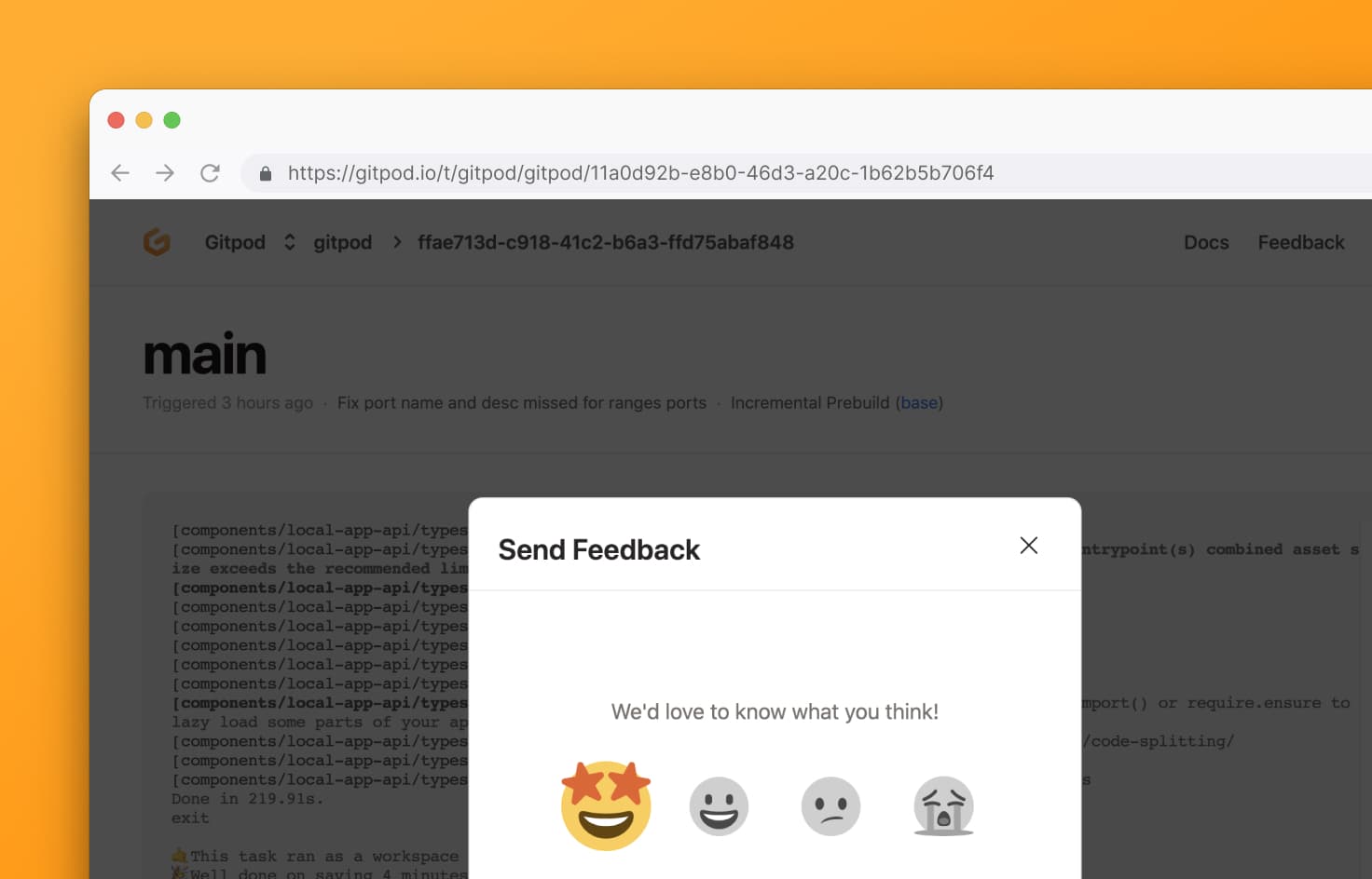 We continue to enhance this feature, but for now we’d love to hear about your experience. Please let us know in the feedback issue, contact us via Twitter @gitpod or chat with us at https://www.gitpod.io/chat.