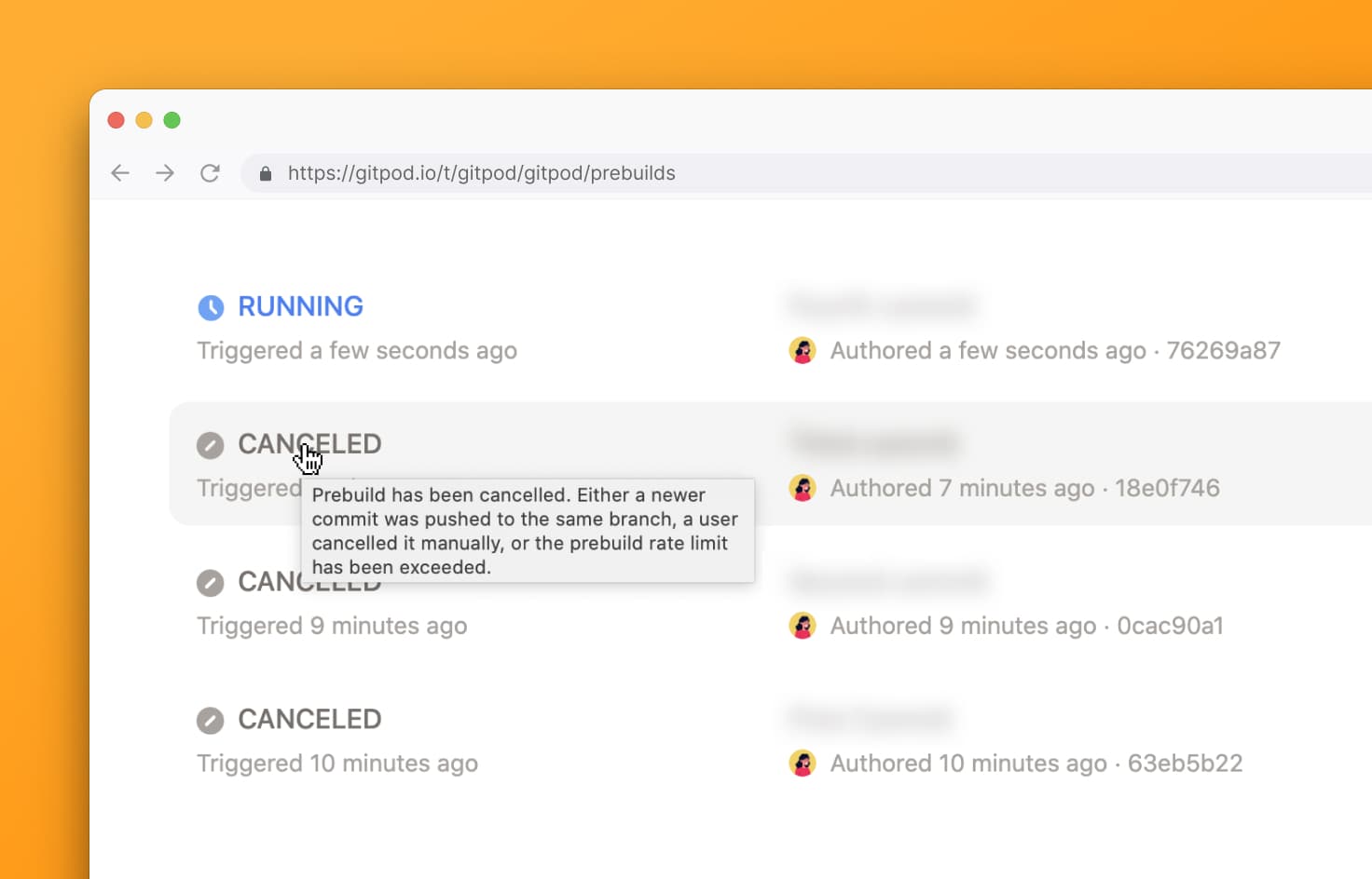 So far, Gitpod started each prebuild from a clean slate. With this latest release, Gitpod now supports incremental prebuilds, which means Gitpod will try to re-use a prebuild from an earlier commit in order to create new prebuilds faster. In short, it now takes less time for your prebuild to be ready after a new commit is pushed to your Git provider.