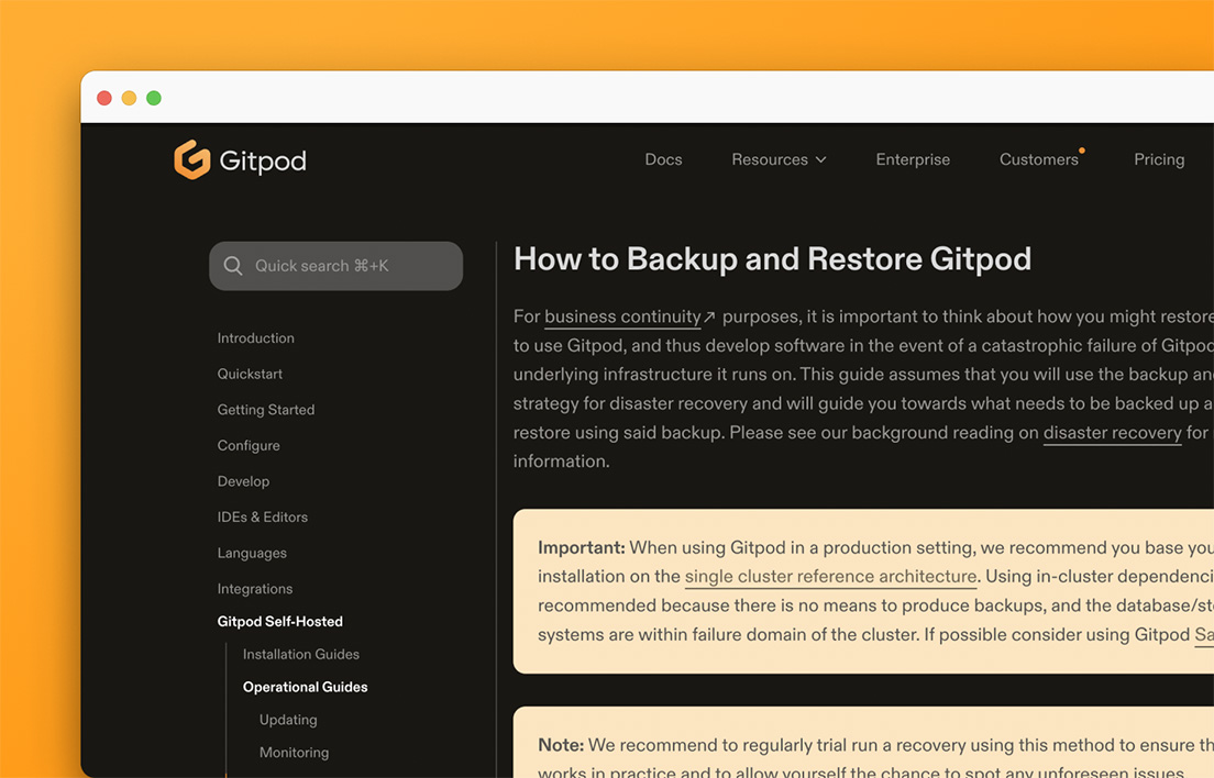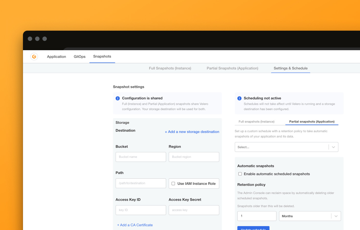We’ve added the ability to back up your Gitpod application config (no workspace or database data is backed up!) via the KOTS Installation UI under the “snapshots” tab. You can even configure automatically scheduled backups. You can learn more in our backup and restore guide.